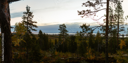 Obraz premium Scenic morning view over Nordic forest and distant lakes from a hillside vantage point