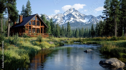 Fototapeta premium Scenic Mountain Cabin Surrounded by Pine Trees and Clear Stream Under Blue Sky