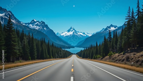 Naklejka premium Scenic Mountain Highway Road Trip: Stunning View of Snow-Capped Peaks and Serene Lake