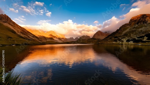 © swdesain, Fototapeta premium Scenic Mountain Lake Reflecting Sunrise with Dramatic Clouds and Mountain Peaks