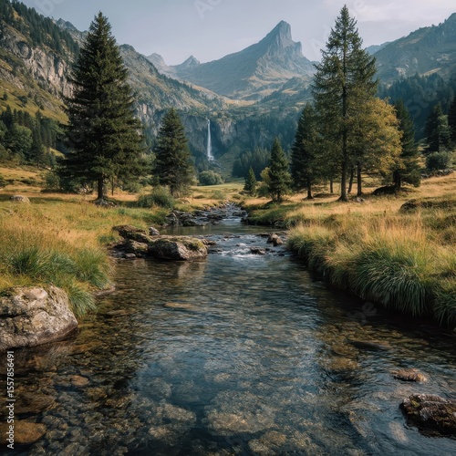 © Piksel, Obraz premium Scenic mountain landscape featuring a stream, waterfall, and trees