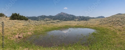 © PBMasterDesign, Fototapeta premium Scenic mountain landscape featuring a tranquil pond surrounded by lush greenery.
