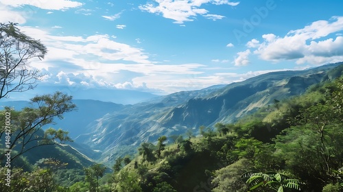 Naklejka premium Scenic Mountain Landscape Under A Bright Blue Sky And White Clouds