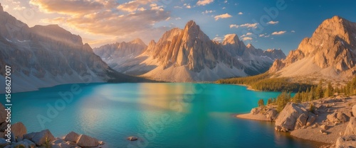 Obraz premium Scenic mountain landscape with a turquoise lake, rugged peaks, and a partly...