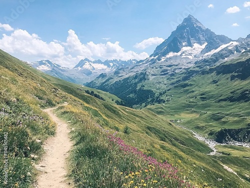 © MetaKibo, Fototapeta premium Scenic mountain landscape with a winding path and vibrant wildflowers.