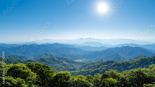 Obraz premium Scenic Mountain Landscape With Lush Green Forest Under Bright Sunny Sky
