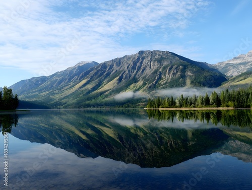 © Anucha, Fototapeta premium Scenic mountain landscape with lush green trees overlooking calm reflective lake under blue sky with clouds and mist