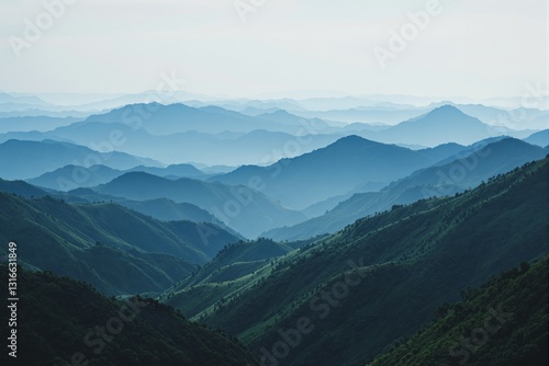 Obraz premium Scenic mountain landscape with misty blue layers of rolling hills, creating a...