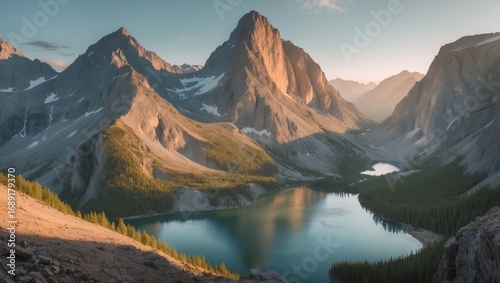 Obraz premium Scenic mountain landscape with peaks, a lake, and forest, showcasing natural...