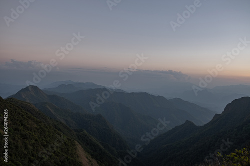 Obraz premium scenic mountain lined with alternates. The morning sun shines and fog covered the mountain. Doi KALHEPU, Mae Moei, Tak in Thailand