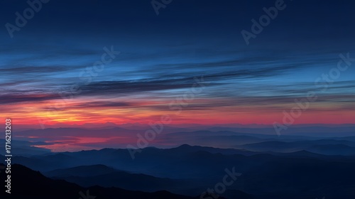 Fototapeta premium Scenic mountain range at twilight with a colorful sunset, creating a peaceful...