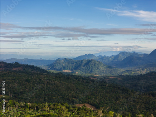 Obraz premium Scenic mountain range under clear blue sky on sunny day in rural landscape