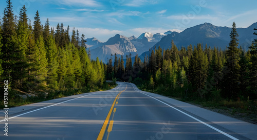 Naklejka premium Scenic mountain road through a vibrant green forest leading to majestic snow-capped peaks under a clear blue sky, evoking journey, travel, and wilderness adventure.