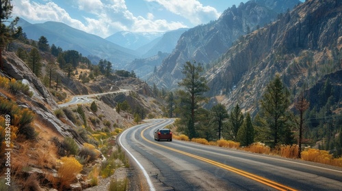 © Intelligent Horizons, Fototapeta premium Scenic mountain road winding through an autumn landscape with vibrant foliage and a car driving along the curving path Outdoor adventure and travel concept