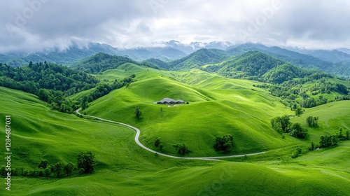 Fototapeta premium Scenic mountain road winding through lush green hills, house in valley