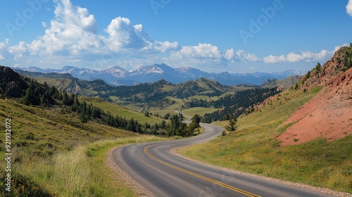 Fototapeta premium Scenic mountain road with sweeping curves and distant peaks, surrounded by...