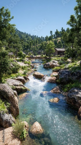 Naklejka premium Scenic mountain stream flowing through lush green forest, clear blue sky