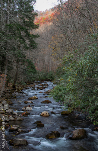 © BJ Ray, Obraz premium Scenic mountain stream panorama captured in fall with vibrant foliage and gentle rapids
