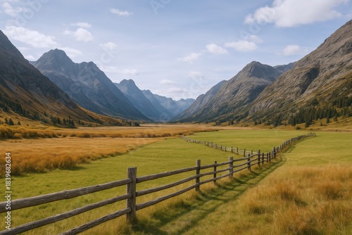 Fototapeta premium Scenic Mountain Valley Landscape with Wooden Fence, Meadows, and Distant...