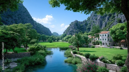 © jklweiou, Fototapeta premium Scenic Mountain Valley with Lush Greenery River and Traditional Village Under Blue Sky
