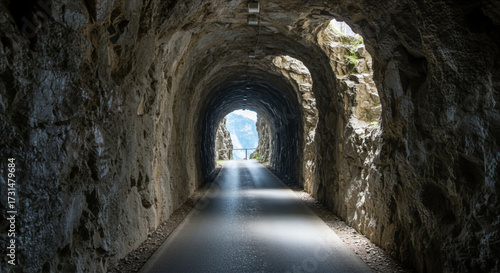 Fototapeta premium Scenic mountain view from rocky cave tunnel with natural sunlight.
