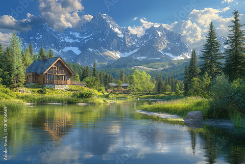 Fototapeta premium Scenic mountain view with a tranquil river and rustic cabin surrounded by...