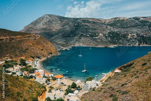 Naklejka premium Scenic mountains and blue sea port with sailing boats in Porto Kagio, Mani,...