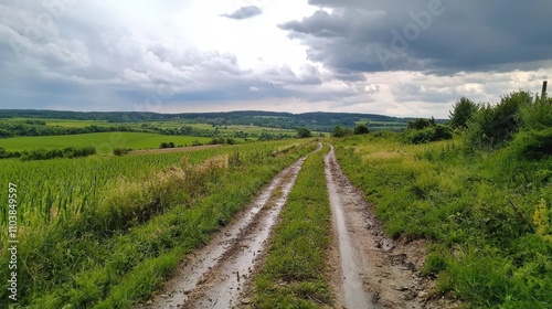© InfinityArtCreator, Fototapeta premium Scenic Muddy Path Through Green Fields Under Dramatic Sky