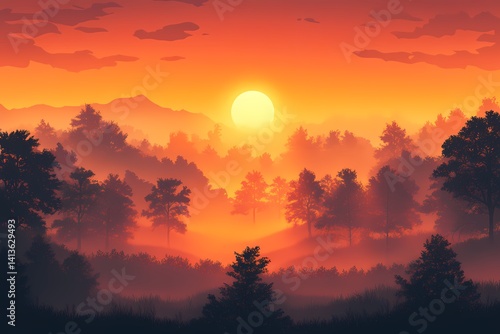 Fototapeta premium Scenic Nature Sunset Over Silhouetted Forest with Vibrant Yellow and Orange...