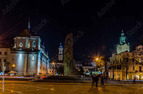 Fototapeta premium Scenic night Lviv cityscape architecture on the long exposure