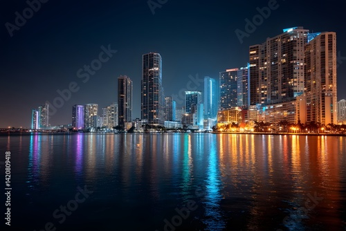 Naklejka premium Scenic Night View of City Skyline Reflected in Water Illuminated by Colorful...
