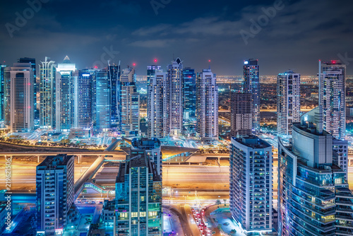 © Funny Studio, Obraz premium Scenic nighttime skyline of big modern city. Aerial view on skyscrapers and highways of Dubai Marina, UAE. Multicolored travel background.