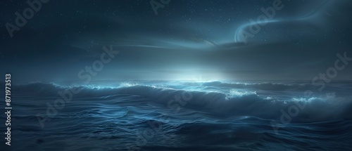 Naklejka premium Scenic ocean view at night with calm waves and a mystical atmosphere under a...