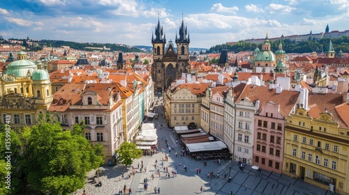 © SETSU 21, Fototapeta premium Scenic Overhead View of Prague with Cityscape and Historic Architecture
