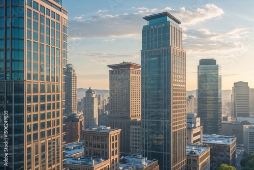 © Michael, Fototapeta premium Scenic Overlook of Eye-Catching Office Buildings Amidst Fresh Skies and Bustling Urban Life