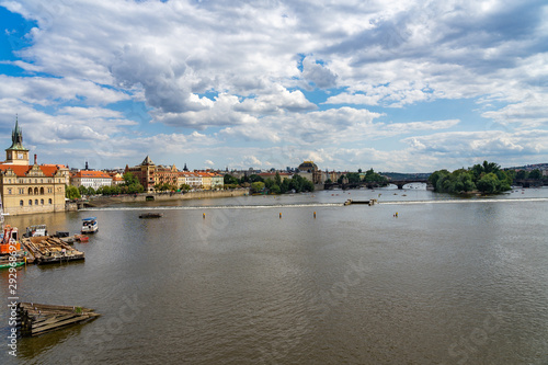 Obraz premium Scenic panorama cityscape view of Moldava river boat Prague in Czech Republic.