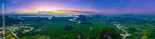 © Parilov, Fototapeta premium Scenic panorama landscape of phang nga Thailand at sunset with lush greenery and limestone formations