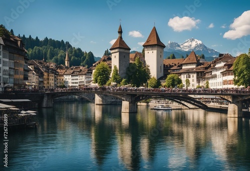 Fototapeta premium Scenic panoramic view of a city with river, bridge, chapel and mountains
