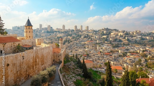 Naklejka premium Scenic panoramic view of Jerusalem showcasing historic architecture and...