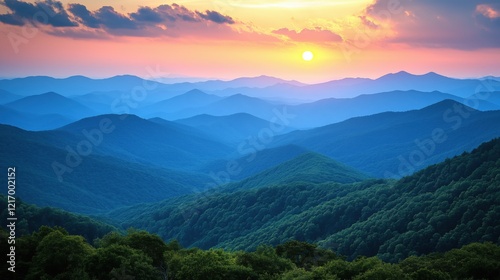 © Lisouski Uladzimir, Obraz premium Scenic panoramic view of layered mountain ranges at sunset with vibrant colors