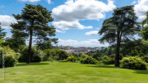 © Fozle, Naklejka premium Scenic Park View, Lush Greenery, Majestic Trees, Distant Town