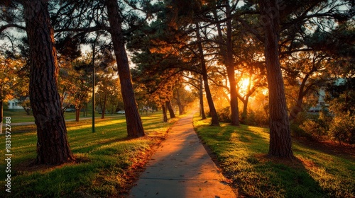Fototapeta premium Scenic pathway in park lined with trees during glowing sunrise creating a...