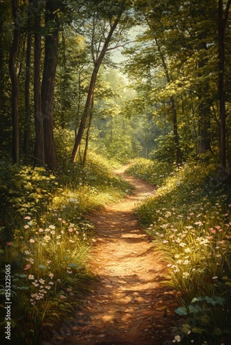 © BrandwayArt, Fototapeta premium Scenic pathway through a lush forest at golden hour