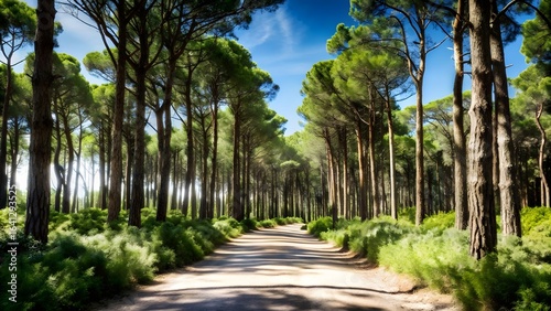 Fototapeta premium Scenic Pathway Through Dense Pine Forest Under Clear Sky