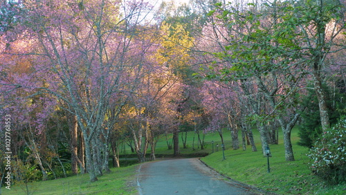 Naklejka premium Scenic pathway through park lined with blooming cherry blossom trees, showcasing beauty of nature and tranquility in springtime. Nature and Tranquility.