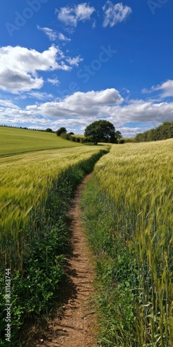Fototapeta premium Scenic pathway through verdant wheat fields under blue sky
