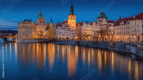 Fototapeta premium Scenic Prague Cityscape at Dusk Reflecting in Vltava River, Czech Republic, Featuring Historical Architecture