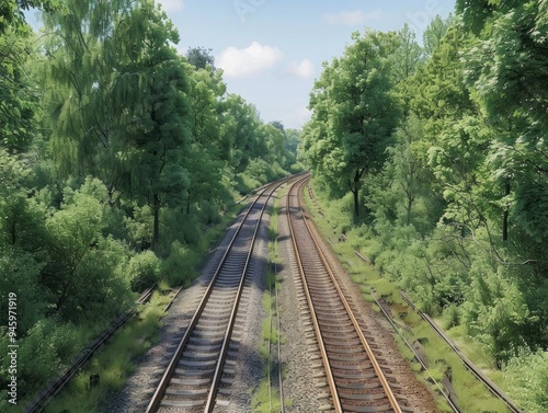 Fototapeta premium Scenic Railway Line Through Dense Forest Capturing the Essence of a Voyage,...