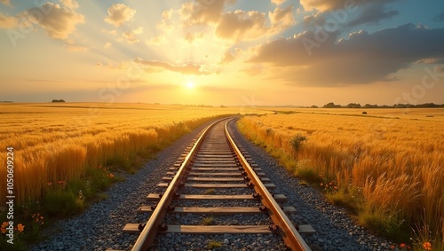 © GMeta, Obraz premium Scenic railway tracks in golden wheat field under summer sky
