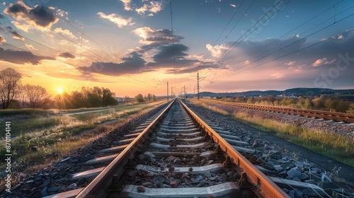 Fototapeta premium Scenic Railway Tracks Leading Towards a Beautiful Sunset. Tranquil Landscape...